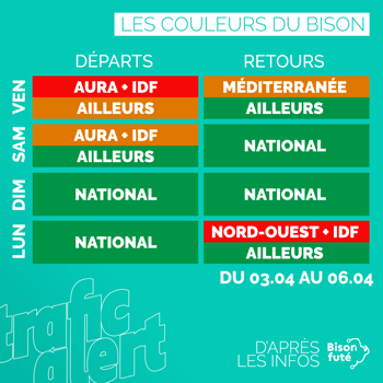 BRIEF Bison Futé est au vert jusqu’au jeudi 2 avril veille d’une journée avec de l’orange et du rouge en Rhône-Alpes et Île-de-France.